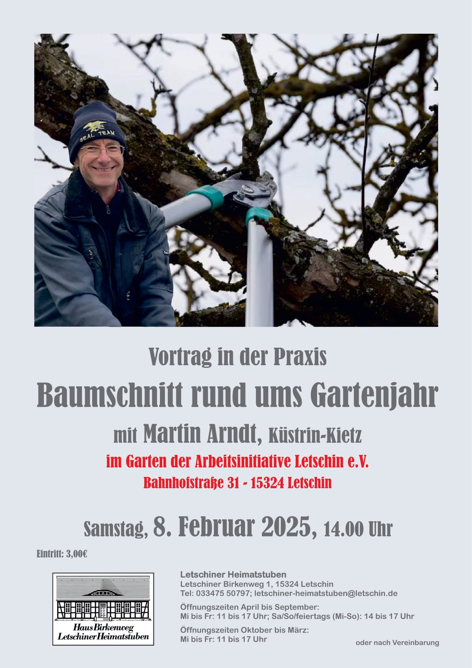 Am 8. Februar findet ein Praxis-Vortrag mit der Gärtnerei & Baumschule Arndt/ Küstrin-Kietz im Garten der Arbeitsinitiative Letschin (Bahnhofstraße 31) statt. Das Thema des Vortrags ist „Baumschnitt rund ums Gartenjahr“ .