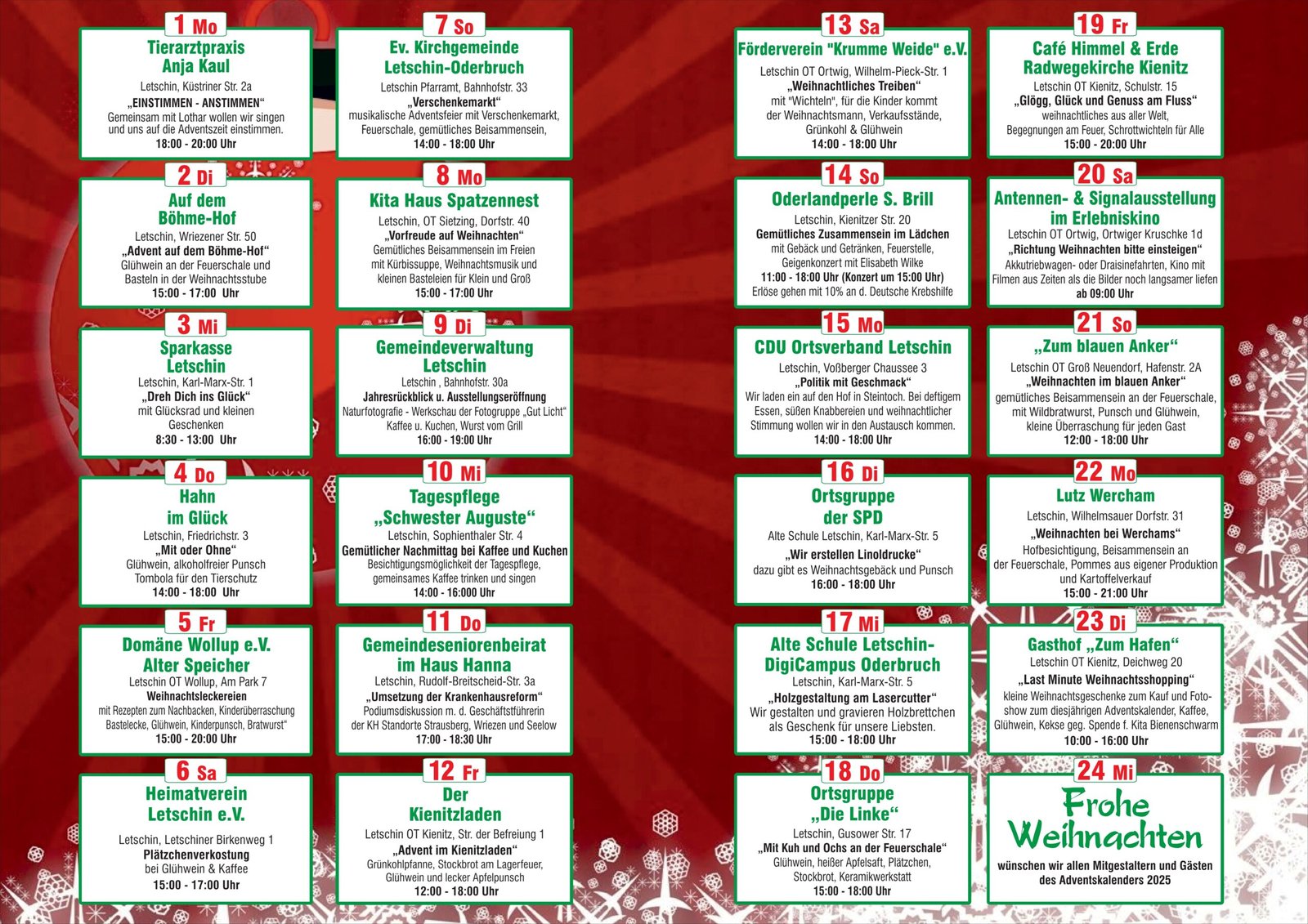 Datum Montag - Dienstag, 01 - 23 Dez. 2025 Labels Heimatstube,Startseite Lebendiger Adventskalender 2025 Weiterlesen: Termine lebendiger Adventskalender 2025 00 Tage 00 Stunden 00 Minuten 00 Sekunden