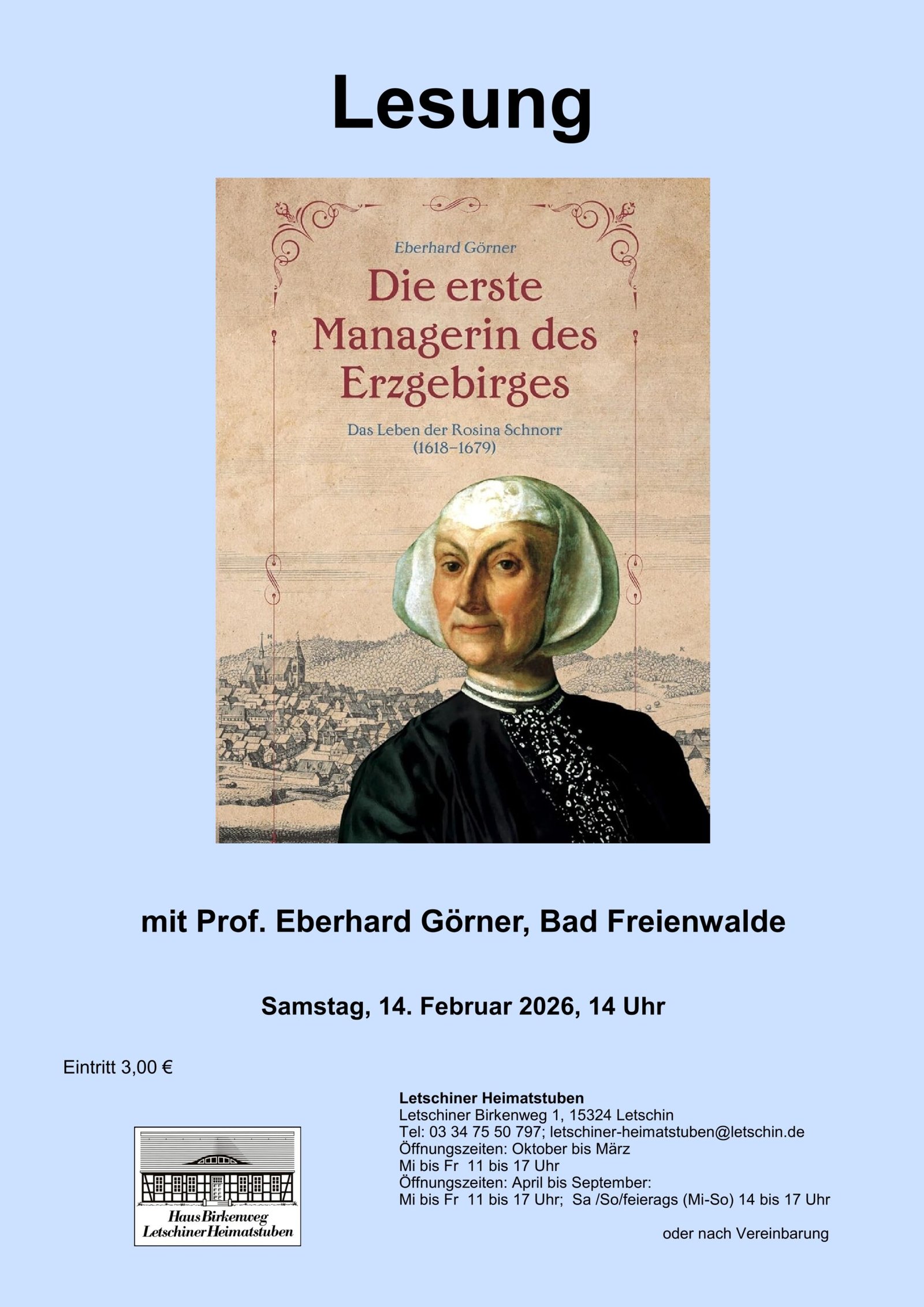 Am 14. Februar findet eine Lesung mit Prof. Dr. Eberhard Görner aus Bad Freienwalde in den Letschiner Heimatstuben statt.