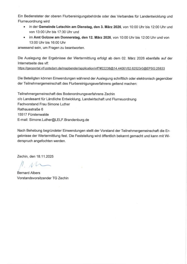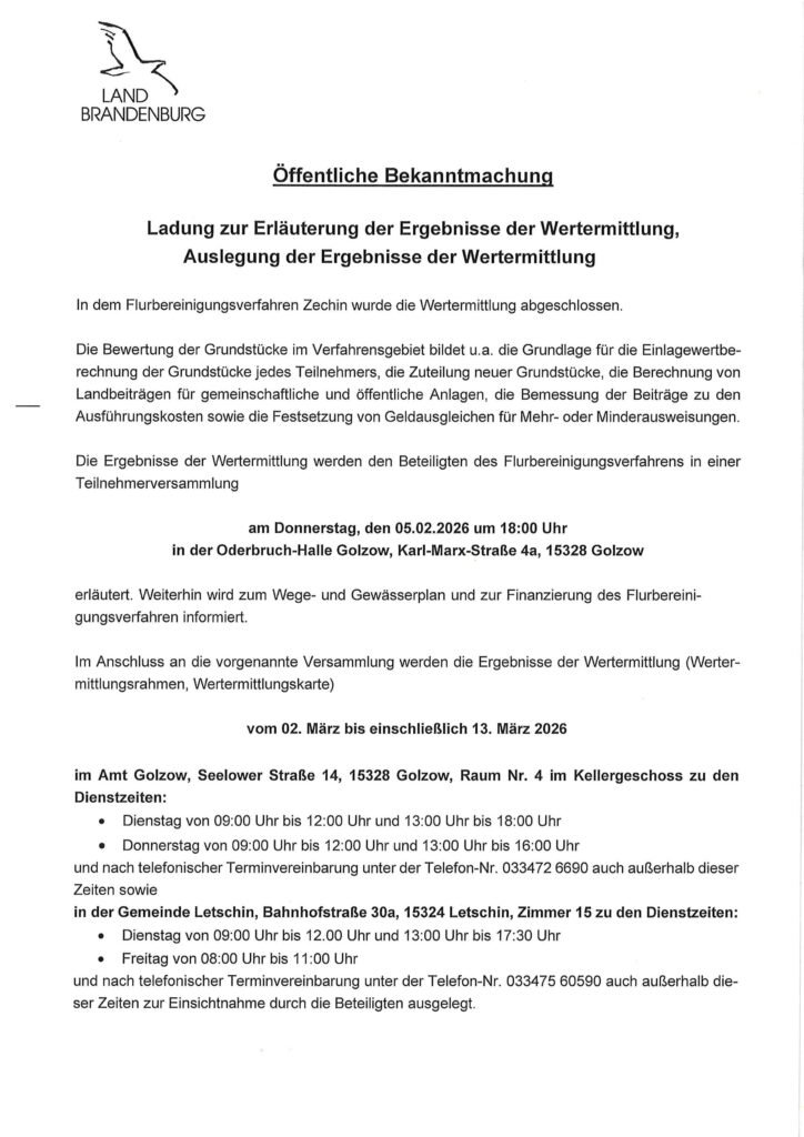 Öffentliche Bekanntmachung – Flurbereinigungsverfahren Zechin