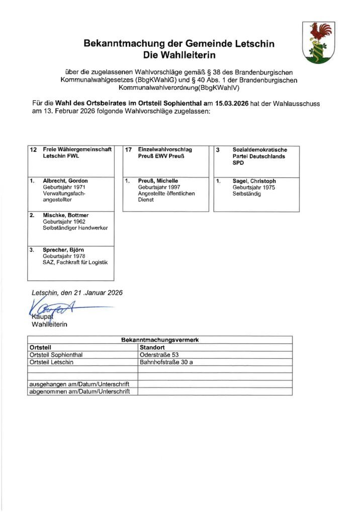 Wahlbekanntmachung zum Ortsbeirat Sophienthal