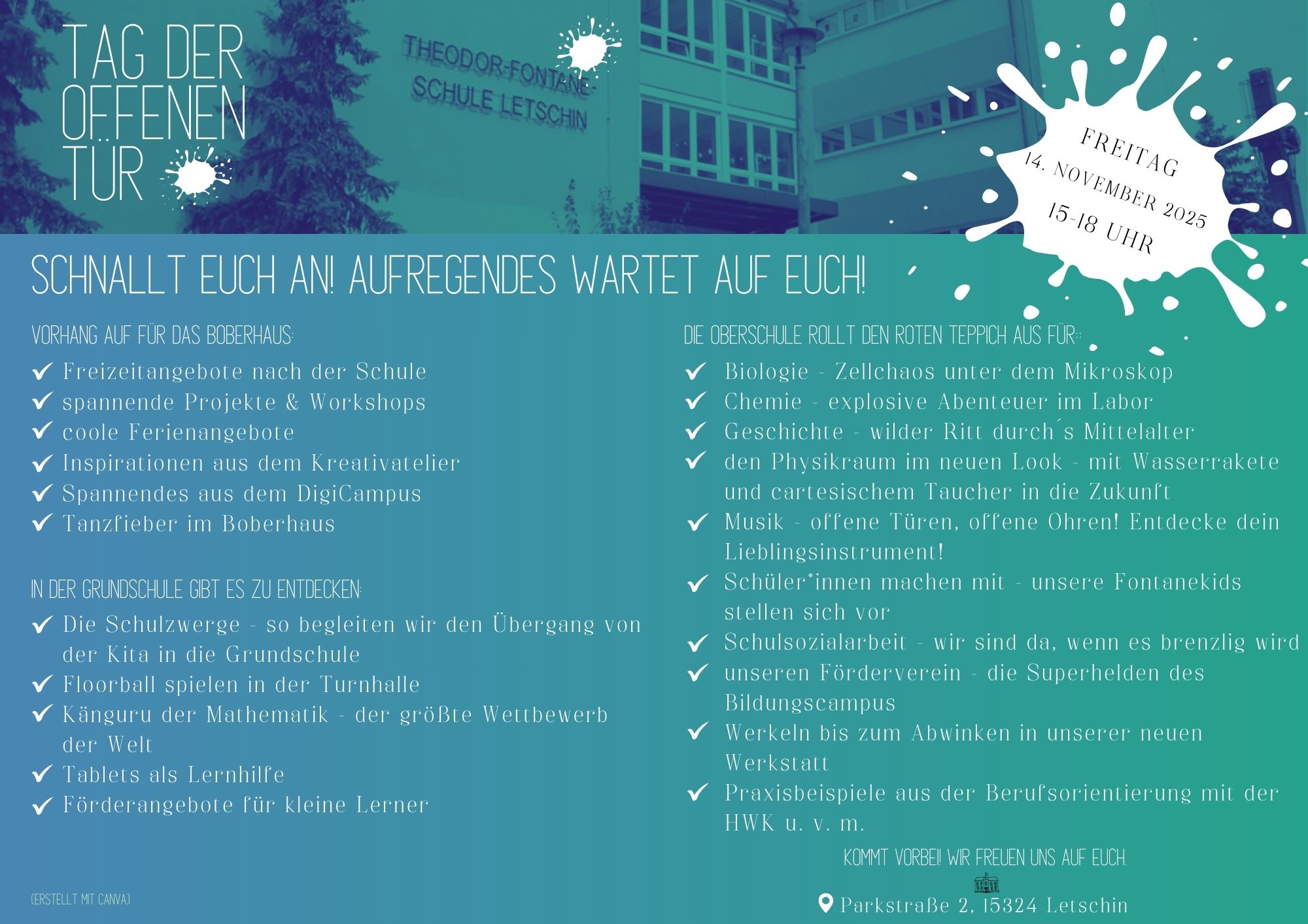 Datum Freitag, 14 Nov. 2025 Uhrzeit 15:00 - 18:00 Labels Startseite Theodor-Fontane-Schule Letschin: Tag der offenen Tür Weiterlesen: Plakat – Tag der offenen Tür – Theodor-Fontane-Schule Letschin 00 Tage 00 Stunden 00 Minuten 00 Sekunden